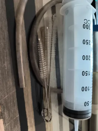Kit de accesorios para la limpieza de acuarios. - Jeringa medidora de 300 CC. - Dos cepillos de limpieza de diferentes tamaños. - Tubo flexible.