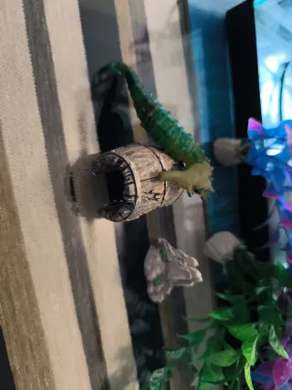 Conjunto de adornos para decorar tu pecera. Añaden un toque natural y colorido a tu acuario. - Diseño de barril con criatura. - Plantas artificiales de colores vibrantes.