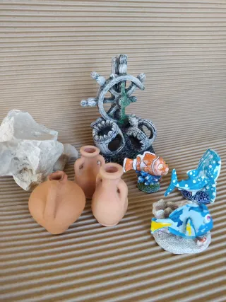 Conjunto de elementos decorativos para acuarios y peceras. - Figuras de peces y tiburón. - Barco naufragado con timón. - Vasijas de terracota. - Roca decorativa. Estado tal cual fotos.