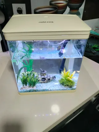 Pecera 14 litros de la marca Nobleza, con un diseño moderno y elegante. - se vende con 2 filtros . - Acabado en color beige y transparente. - Incluye decoración interior con plantas y un submarino. - Tapa superior con iluminación.