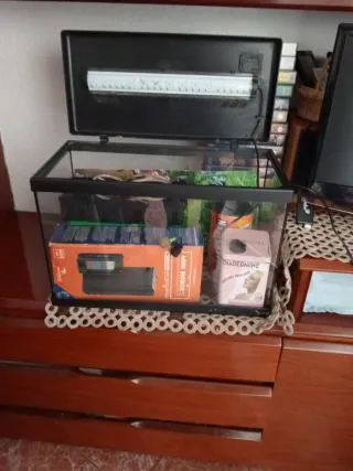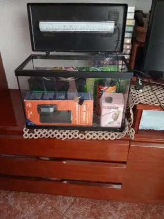 Acuario de cristal con su tapa. Todo equipado, filtros en muy buen estado - Material: Cristal. - Color: Transparente.