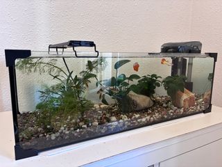 Acuario para peces con un diseño moderno y elegante, estilo "shallow". Incluye filtro Aquaclear 20 y calentador Eheim, todo comprado en agosto del 2025, como nuevo! Incluye panel de iluminación, rocas y plantas, y todo lo que se ve en las fotos.