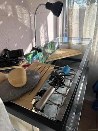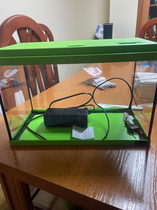 Acuario completo con todos los accesorios necesarios para empezar desde el primer día. Incluye: • Pecera de cristal con tapa e iluminación • Filtro interno con bomba y material filtrante • Calentador regulable (ideal peces tropicales) • Sistema de oxigenación (Venturi) • Sustrato nutritivo JBL Manado y grava decorativa • Fibra filtrante (perlón) • Limpiacristales magnético • Red para peces • Decoraciones (cueva cerámica y concha) Todo el sistema funciona correctamente. El acuario tiene algunos desperfectos del uso (rotitos en la tapa, por eso tiene cinta pegándolo ), pero no afectan en nada a su funcionamiento ni a la estanqueida
