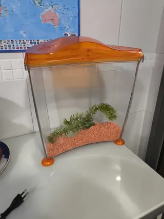 Pecera o acuario de plástico - Base con patas naranjas. - Tapa superior naranja con detalles. - Interior con grava decorativa y planta artificial. - aparato oxigeno agua funcionando