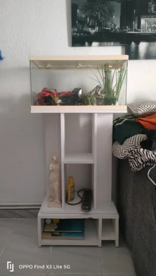 Conjunto de pecera y mueble. - Pecera de cristal. - Mueble blanco.