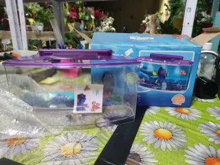 Pecera temática de Dory, personaje de Buscando a Nemo. Ideal para pequeños peces o como elemento decorativo. - Tapa morada con asa. - Diseño transparente. - Incluye pegatinas de personajes.