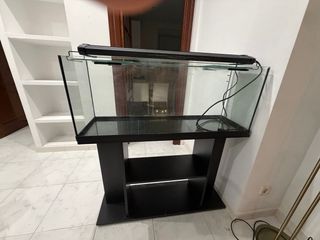 Pecera sin accesorios de 55 litros junto con el mueble, o por separado. Se entrega vacío y limpio. La balda del mueble está vencida. Pero al no estar pegado el mueble la balda puede ponerse del revés y no se notaría. Negociable.