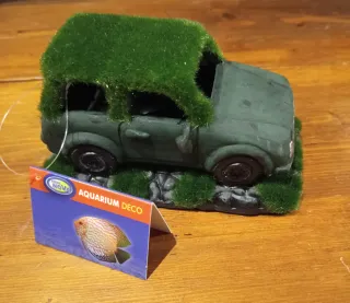 Adorno decorativo para acuario con forma de coche cubierto de musgo. Añade un toque natural y original a tu pecera. - Diseño de coche vintage. - Cubierto de césped artificial. - Base con rocas y vegetación. - Resiste exposiciones prolongadas al agua Ideal para que los peces entren y se diviertan