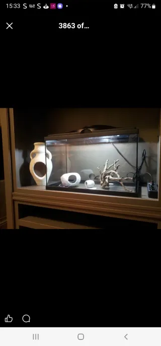 Pecera de 38 litros completa, con calentador, termómetro, adornos para la pecera, dos filtros ,uno de ellos usado para una sola vez. También tiene herramientas para la limpieza de la pecera.Todo muy bien cuidado. Todo tiene sus cajas originales.