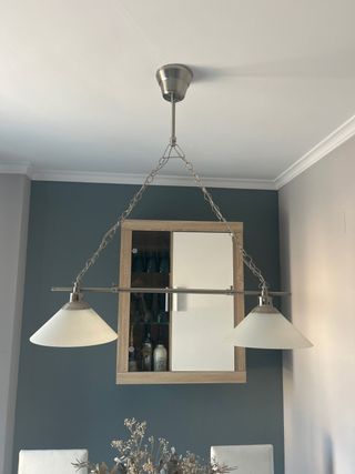Lámpara de techo metálica con cristal blanco. Ideal para cualquier espacio amplio. - Dos pantallas de cristal blanco opalino. - Estructura metálica ajustable en color plata. - Cadena de suspensión metálica. Su altura y su ancho se pueden ajustar (hacer más corta y más estrecha), aunque en sus medidas actuales es como más luce. **Sólo recogida. No se hace envío** Si tienes cualquier pregunta, no dudes en cosultar.