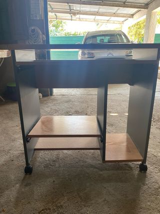 Mesa de escritorio de dos niveles en color marrón. Es compacta y práctica. - Perfecta para espacios reducidos. - Diseño sencillo y funcional. - Superficie lisa y en buen estado. Perfecta para poner un ordenador torre o para un estudio cómodo.