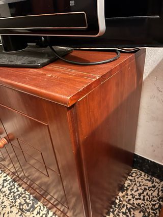 Mueble auxiliar de madera en buen estado, ideal para usar como mueble de televisión, almacenaje o para cualquier rincón del salón o dormitorio. Tiene dos puertas con tiradores de madera y un diseño sencillo y práctico. Interior con espacio para guardar objetos, aparatos o accesorios. Es estable, fácil de combinar con cualquier decoración y muy útil en espacios pequeños. mueble madera, mueble TV, mueble auxiliar, armario pequeño, almacenamiento, mueble salón