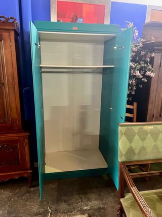 Armario de gran capacidad con un diseño moderno y llamativo. - Puertas con tiradores integrados. - Acabado en un vibrante color verde azulado.