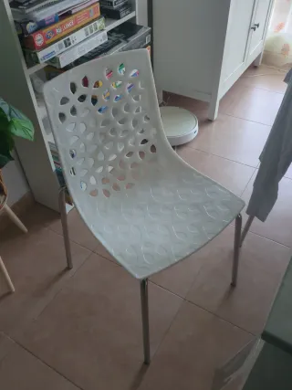 Set de cuatro sillas blancas, completamente nuevas y en su embalaje original. - Estructura de metal. - Asiento de plástico. Las sillas son blancas. La patas negras