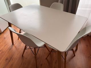 Conjunto de mesa con cuatro sillas nórdicas a juego. El conjunto está en perfecto estado, como nuevo. - Mesa con patas de madera. - Sillas con diseño moderno y patas de madera. **No dudes en preguntar**😁