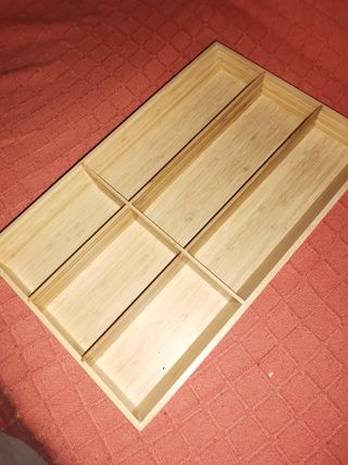 Práctico organizador de bambú con varios compartimentos, ideal para mantener el orden en tus cajones. - Fabricado en bambú natural. - Diseño con múltiples divisiones. - Tonos beige y marrón. Medida 31x49