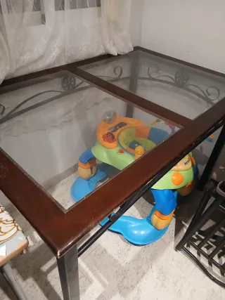 Conjunto de mesa con superficie de cristal y cuatro sillas. - Estructura de la mesa en madera y metal. - Sillas con detalles decorativos.