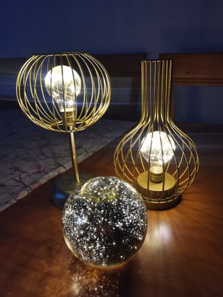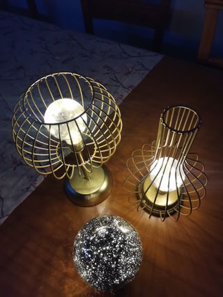 Conjunto de tres luces decorativas con un diseño moderno y elegante. Son de sobremesa, no para colgar - Lámpara de mesa con pantalla esférica de metal dorado. - Lámpara de pie con pantalla alargada de metal dorado. - Bola de cristal decorativa con luces interiores. Funcionamiento a pilas Cada uno 10 eu Si son los 3 por 25 eu