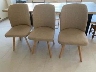 Conjunto de tres sillas de comedor con un diseño moderno y elegante. Tres en Perfecto estado, hay una con la pata rota - Tapicería en tela color beige. - Patas de madera natural. - Respaldo curvo con detalles acanalados.