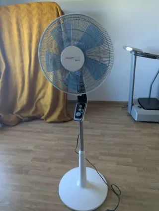 Ventilador de pie Rowenta con un diseño moderno y elegante. No hay botón de rotación automática en la parte trasera (como se ve en la foto). Hay que girarlo manualmente. - Altura ajustable. - Múltiples velocidades. - Base estable.