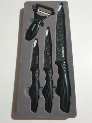 Se vende Set de cuchillos de cocina de la marca German Line formado por 3 cuchillos y un pelador nuevos a estrenar solo sacados para tomar las fotos sin usar. Está formado por Cuchillo de chef, Cuchillo de filetear, Cuchillo pequeño, Pelador de verduras. Juego de 3 cuchillos de cocina y 1 cuchillo pelador Germán Line (Negro) ideal regalo urge no acerco no negociable no reservo