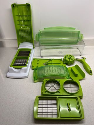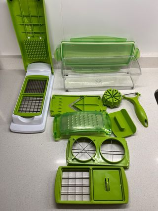 Set de cortador y pelador de verduras con múltiples accesorios. - Incluye varios cuchillas para diferentes cortes. - Contenedor para recoger los alimentos. - Pelador integrado.