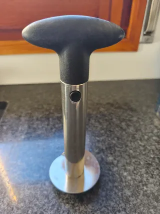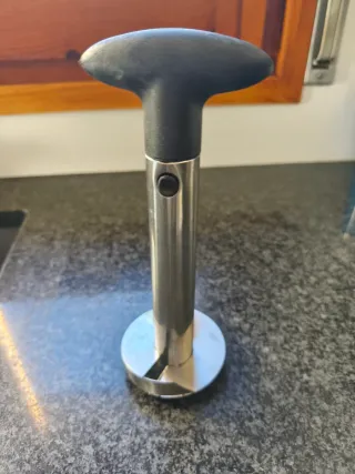 Herramienta para pelar piñas de forma sencilla. - Mango ergonómico de plástico. - Cuerpo cilíndrico de metal. - Base circular de metal.
