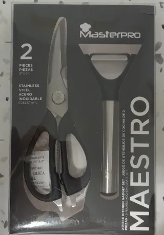 ✨ Set de cocina Masterpro Maestro compuesto por: ✔️ Tijeras de cocina – 21 x 7,6 x 1,1 cm ✔️ Pelador – 6,5 x 17 cm 🔹 Material: Acero inoxidable 🔹 Marca: Masterpro 🔹 Estado: Nuevo, sin usar (en su embalaje original) Las tijeras son resistentes y multiusos, perfectas para carne, verduras o abrir envases. El pelador es cómodo, ligero y muy preciso. 💎 Diseño elegante en negro y acero inoxidable. 🎁 Ideal para uso diario o para regalo. 📦 Se envía bien protegido.