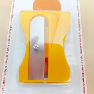 Pelador de verduras con bonito diseño de sacapuntas en color amarillo. Pela, afila y riza cintas de zanahoria, calabacín, pepino y otras hortalizas similares. Útil si se quiere añadir un toque especial a las ensaladas o platos. Medidas aprox: 5,5 x 4 x 8 cm. El producto nunca se ha usado pero la caja está maltrecha.
