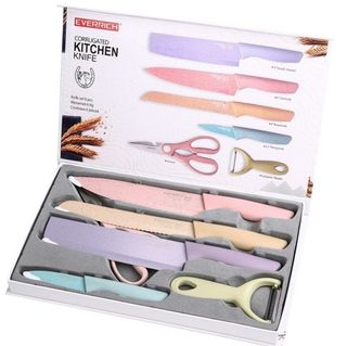 , Los cuchillos son utensilios indispensables en cualquier cocina, ya sea de casa o profesional. ,Estos cuchillos destacan por su calidad, pero también por sus bonitos colores pasteles. Incluye: - Cuchillo de chef grande. - Cuchillo para cortar pan. - Cuchillo para pelar. - Cuchillo pequeño. - Tijeras. - Pelador de patatas o verduras. Modelo: ER 0278. Ref. 13849. ,