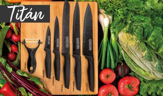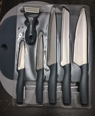 Este set incluye cinco cuchillos, un pelador y una tabla de cortar. - Cuchillos con mangos ergonómicos.