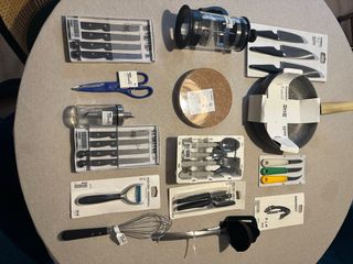Conjunto de utensilios de cocina de IKEA, ideal para estrenar tu nuevo hogar. - Sartén con mango de madera. - Cafetera de émbolo. - Batidor de varillas. - Cazo. - Pelador. - Juego de cuchillos. - Tijeras de cocina. - Posavasos de corcho. - Juego de cubiertos. - Abrelatas - Destapa corchos - Aceitera