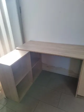 Escritorio en forma de L con un diseño moderno y funcional. Ideal para optimizar tu espacio de trabajo o estudio. - Acabado en tonos madera natural. - Estructura robusta y estable. - Incluye baldas para almacenamiento.