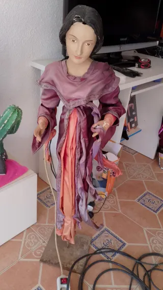 Figura decorativa de un metro de altura. Presenta un diseño detallado y vestimenta colorida. - Altura aproximada: 100 cm. - Vestimenta en tonos morados y naranjas. - para restaurar