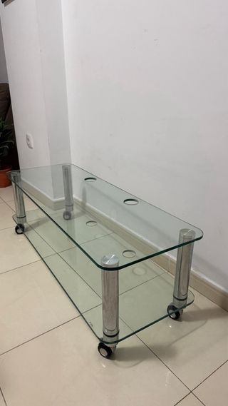 Mesa auxiliar de salón con un diseño moderno y funcional. - Superficie de cristal. - Patas y estructura de metal. - Incorpora ruedas para facilitar su movilidad.
