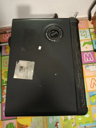 Estufa portátil en color negro, ideal para calentar espacios. - Fabricada en metal y plástico resistente. - Diseño compacto y fácil de transportar.