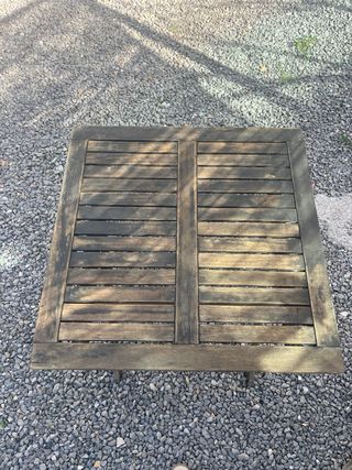 Mesa de madera y metal con diseño plegable. Unas 20 unidades, precio por unidad - Medidas: 70x70 cm. - Estructura plegable para fácil almacenamiento.