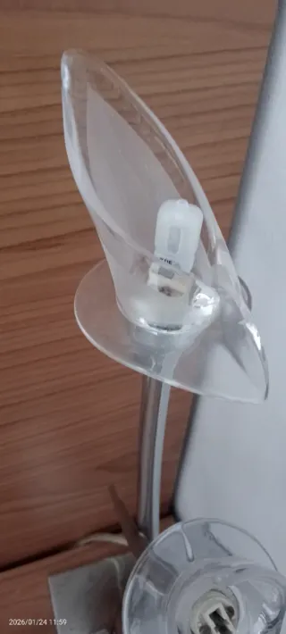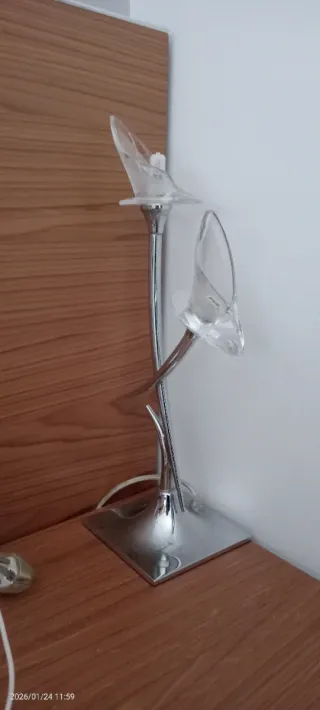 Elegante lámpara de mesita de noche con un diseño moderno y delicado. Perfecta para añadir un toque de luz ambiental. - Base y estructura metálica. - Pantalla de cristal con acabado translúcido.