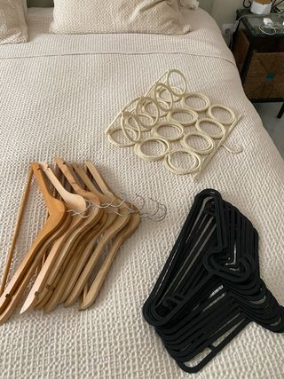 Lote 10 perchas madera y 12 negras y organizador