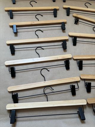 Conjunto de perchas de madera con pinzas metálicas, ideales para colgar pantalones o faldas. - Diseño funcional y elegante. - Materiales duraderos para un uso prolongado.