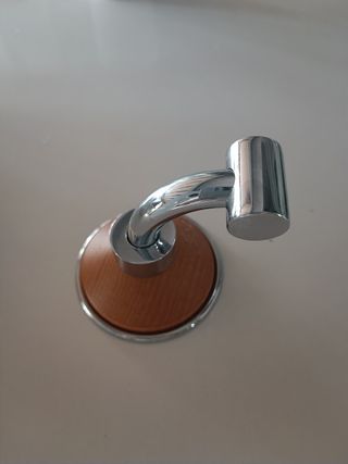 Percha de diseño moderno para el baño. - Base redonda de madera. - Brazo curvo y colgador de metal cromado.