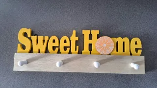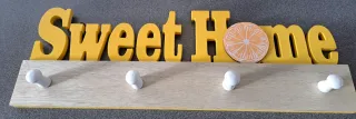 Bonita percha decorativa con el lema Sweet Home y un diseño de rodaja de naranja. - Base de madera. - Ganchos de plástico.