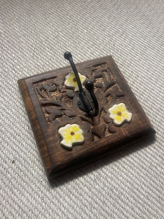 Set de dos ganchos decorativos para pared con un diseño rústico. - Base de madera tallada. - Detalles de flores en cerámica. - Gancho metálico. - perchas de aspecto rustico - medidas 14 x 15