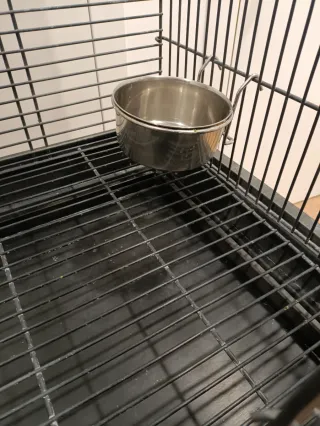 Jaula espaciosa para aves pequeñas como ninfas o agapornis. Ha sido utilizada solo durante una semana. - Estructura de metal resistente. - Bandeja extraíble para facilitar la limpieza. - Incluye comederos y perchas. - Base con ruedas para moverla fácilmente.