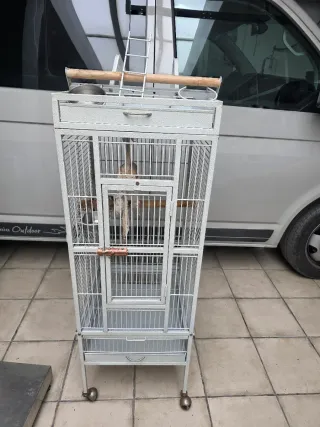 Jaula grande y espaciosa, ideal para pájaros como agapornis o loros. Es un modelo sin estrenar,aun sigue en la caja sin abrir . perfecto para dar un nuevo hogar a tus mascotas. - Medidas: 175.5 cm (alto) x 77 cm (ancho) x 46 cm (profundidad). - Incluye accesorios como perchas y comederos. - Base con bandeja extraíble para facilitar la limpieza. - Ruedas para un fácil desplazamiento. Es la misma q hay en las fotos pero sin estrenar precintada aun en la caja .