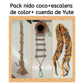 (HAGO ENVÍOS EN TODA ESPAÑA, ITALIA Y PORTUGAL) Pack de accesorios para loros, ideal para enriquecer su espacio. - Nido de coco con escalera. - Columpio de cuerda con cascabeles. #«espiral de cuerda para pájaros agapornis loros periquitos ninfas carolinas pyrrhuras aves yaco guacamayo materiales naturales columpio percha»#