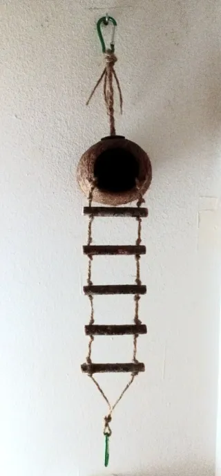 (HAGO ENVÍOS EN TODA ESPAÑA, ITALIA Y PORTUGAL). EXCLUSIVO. (Hecho a mano). Nido de coco con escalera colgante de madera de pino. Nido o cama colgante para pájaros, ideal para agapornis. Fabricado con materiales naturales. - Estructura principal de coco. - Escalera de madera con cuerdas de yute. Con «materiales naturales». - Cierre con mosquetón para colgar. Ideal para: «periquitos forpus agapornis diamantes gould isabelitas del japón loros aves» #«espiral de cuerda para pájaros agapornis loros periquitos ninfas carolinas yaco guacamayo pyrrhuras aves materiales naturales columpio percha»#