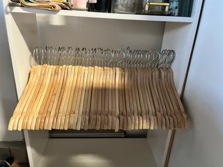 Conjunto de perchas de madera con detalles metálicos. - Diseño elegante y funcional. - Ideales para organizar tu armario. - Poco uso, como nuevas. Vendemos perchas de madera en perfecto estado. Tenemos 50 unidades disponibles y podemos preparar packs según lo que necesites: • Pack 20 → 12 € • Pack 10 → 6 € Lote completo de 50 perchas 28€ Se entregan en Alcobendas.