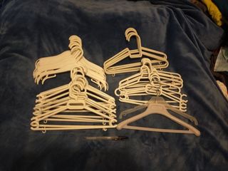 Perchas infantiles de plástico en color blanco. Ideales para organizar la ropa de los más pequeños. - Son 33 perchas en total. - Se encuentran en buen estado. - Perfectas para guardar la ropa de forma ordenada. - El boli es una referencia para el tamaño de las perchas