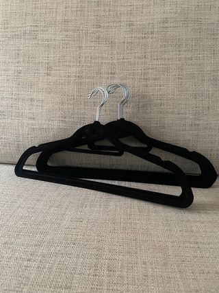 Conjunto de dos perchas de terciopelo en color negro. - Diseño elegante y funcional. - Ganchos metálicos resistentes. En cada pack vienen 10 perchas, quedan disponibles 4 packs.